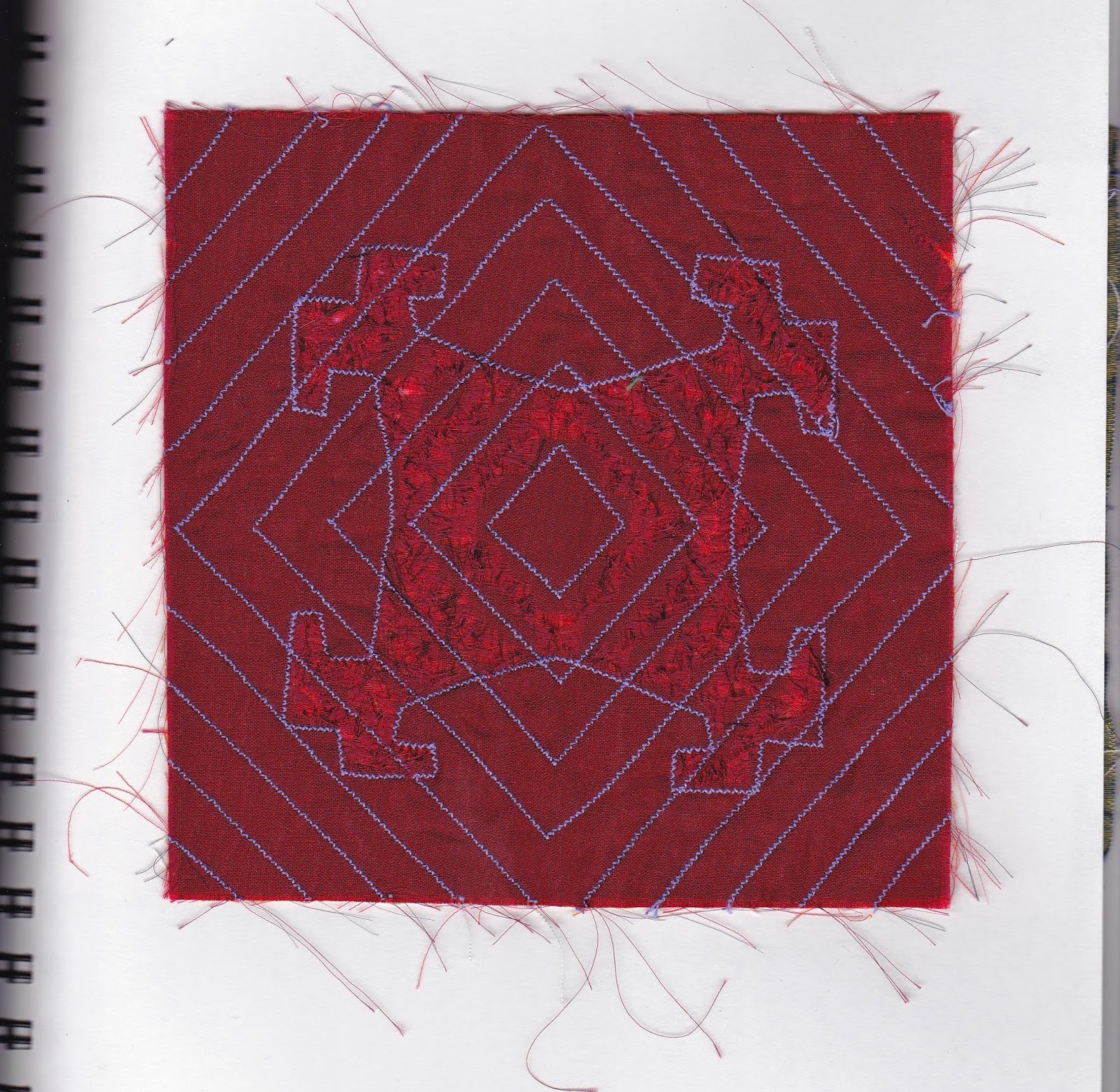 5. This is the resolved sample based on sample 4.  The corner pieces were made out of polyester organza with wonder under backing to give it some stiffness as well as a method of application to the background.  The larger cross, though made from the same fabric, is a slightly stronger red.  I also used some padding stuffing from behind in the trapunto manner, but not so much that it distorted the background too much.  I also used two rounds of machine stitching to make sure that the padding was well contained.  The machine stitched shapes in the background gives the illusion of disintegration as does the hand stitching with the same colour thread as the background fabric.  With the multiple methods of showing disintegration and/or growth, I think it makes this sample quite a bit more dynamic. However the lacy corners softens the effect somewhat and gives some contrast to the stronger colours and shapes.